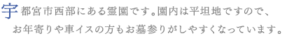 宇都宮市西部にある霊園です。園内は平坦地ですので、お年寄りや車イスの方もお墓参りがしやすくなっており、公園内には「うつのみや遺跡の広場」もあります。